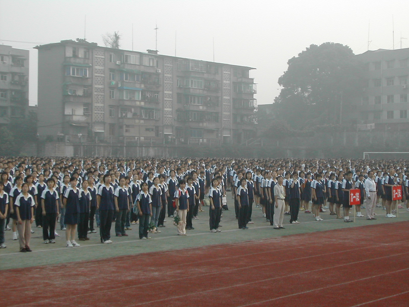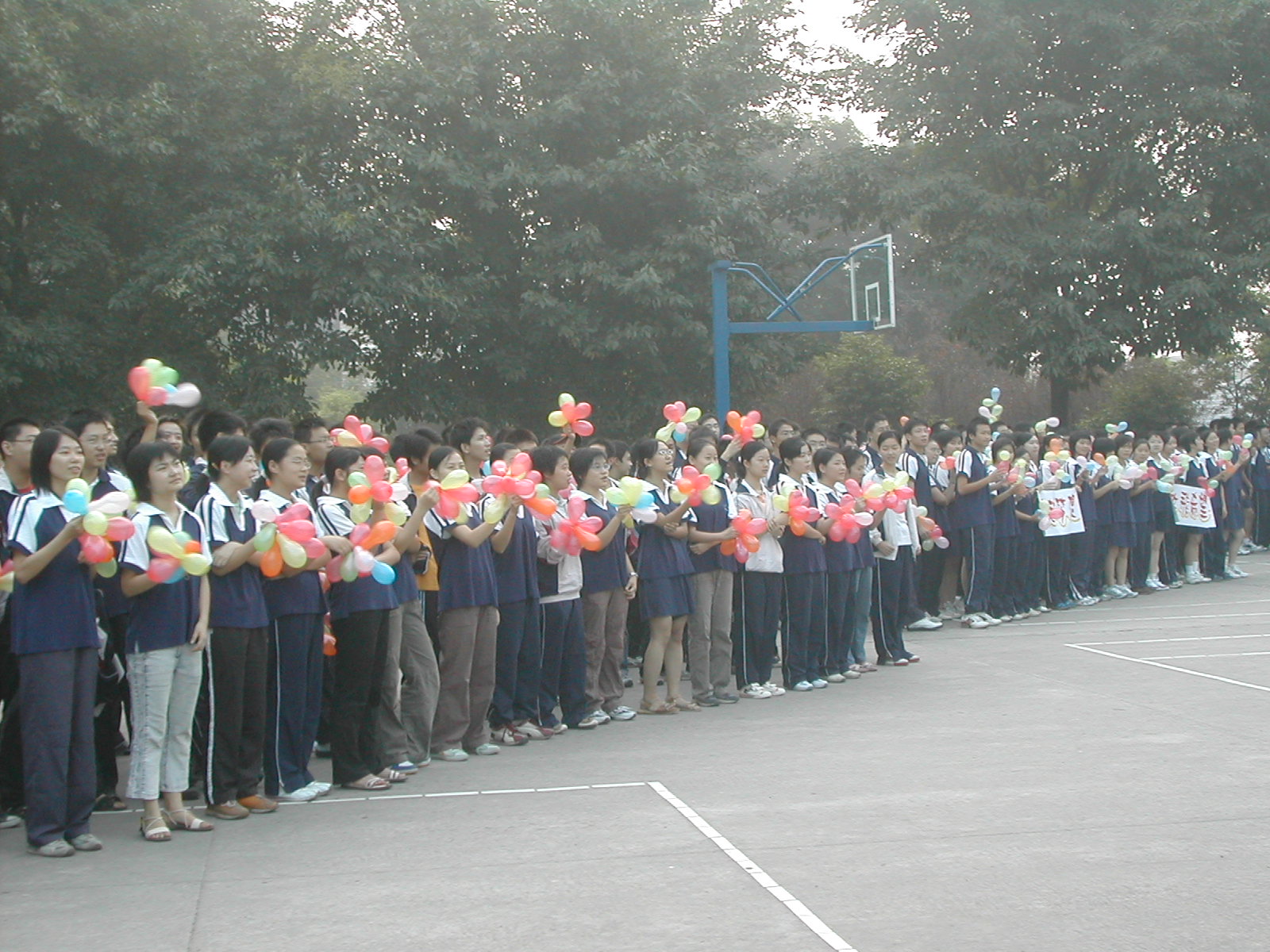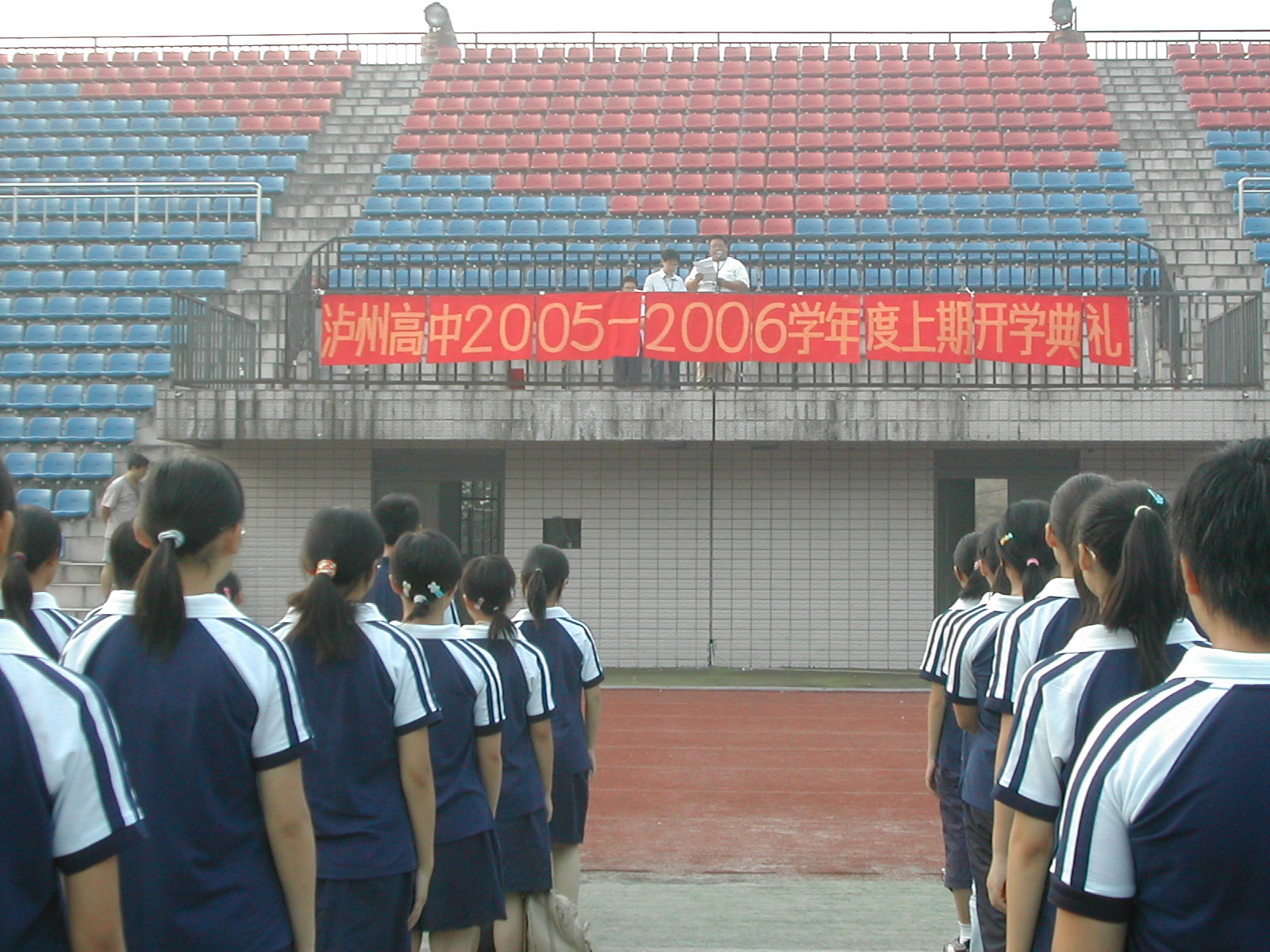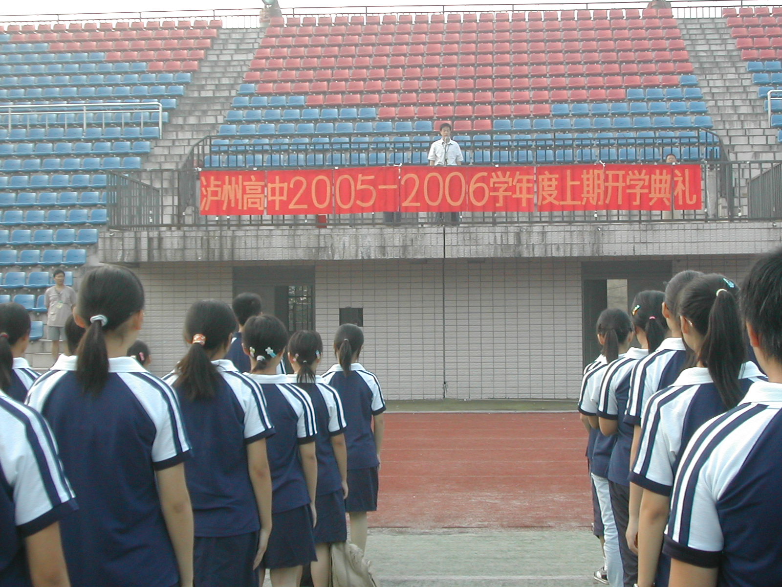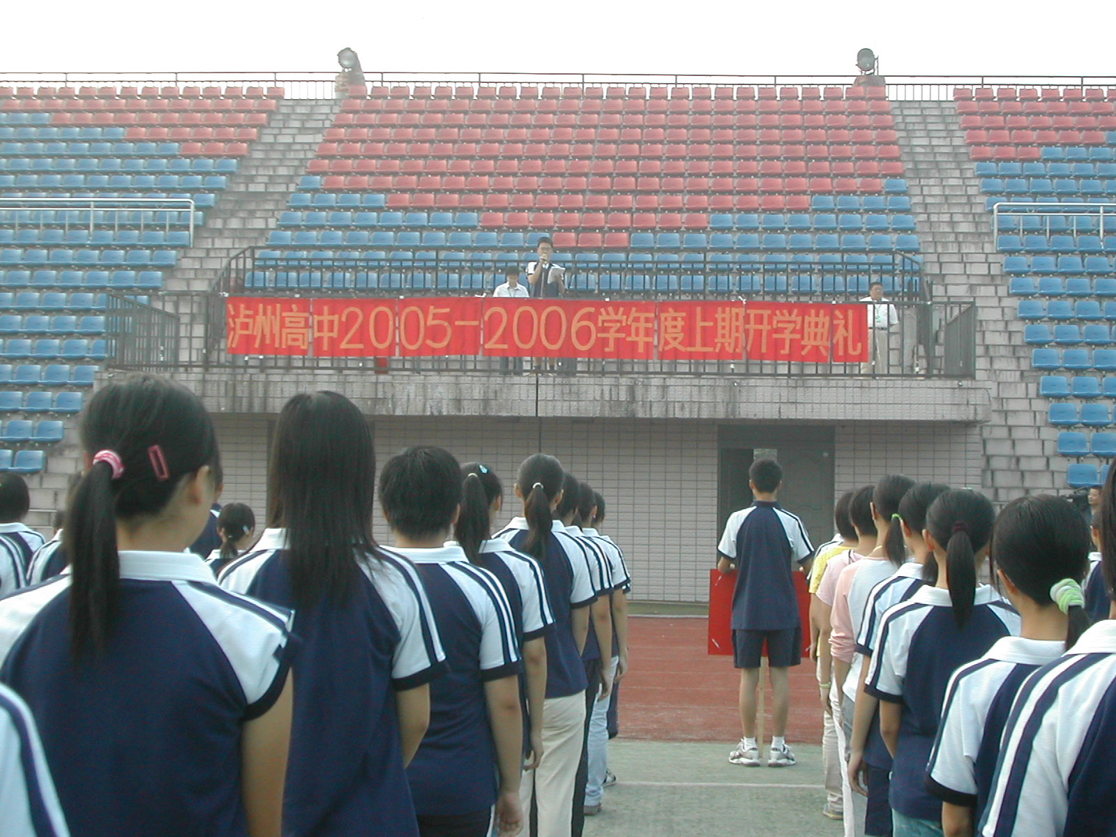 9月1日上午7:20,瀘州高中2005—2006學(xué)年度上期開學(xué)典禮在瀘州高中足球場(chǎng)隆重舉行。首先是新生歡迎儀式。高2008級(jí)新生統(tǒng)一著校服,在校門外排成整齊的隊(duì)形走進(jìn)學(xué)校,學(xué)校領(lǐng)導(dǎo)、全體教職工、高三年級(jí)學(xué)生組成長(zhǎng)長(zhǎng)的隊(duì)伍分列校門兩邊,歡夾道歡迎高2008級(jí)新同學(xué)。新同學(xué)們?cè)跓崃业恼茍?chǎng)中,踏著運(yùn)動(dòng)員進(jìn)行曲進(jìn)入大操場(chǎng)。升國(guó)旗、奏國(guó)歌。學(xué)生會(huì)主席牟一凌代表全體學(xué)生向高2008級(jí)新同學(xué)致歡迎詞,瀘州高中黨總支書記、校長(zhǎng)肖林講話,肖校長(zhǎng)對(duì)新教師和新同學(xué)的到來(lái)表示歡迎,并提出學(xué)校要努力構(gòu)建和諧校園的設(shè)想。