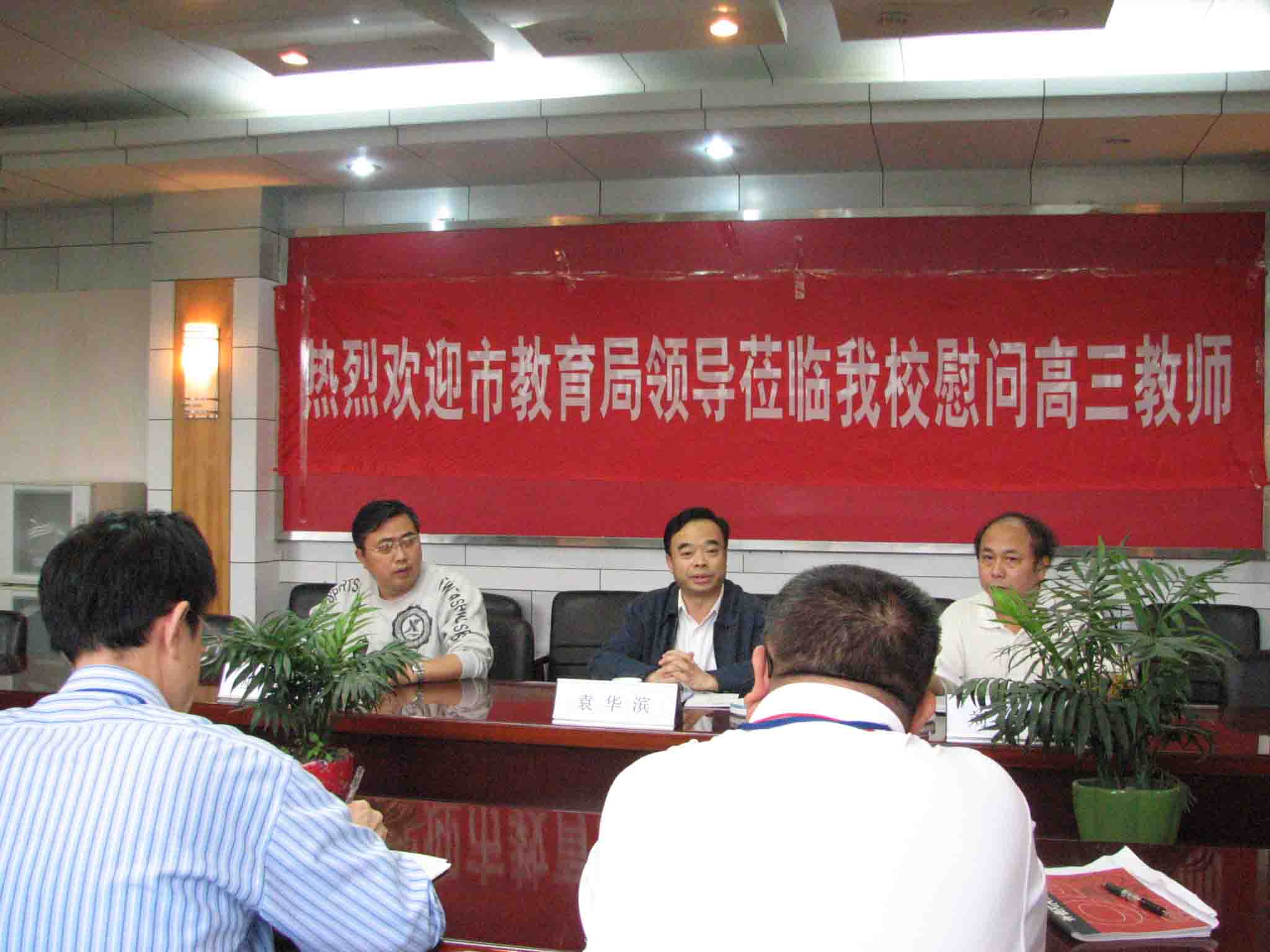 瀘州高中黨總支書記、校長肖林,副校長王曉榮、趙曉林、李渝江向袁華濱一行匯報了今年高三教育教學(xué)質(zhì)量狀況、后期管理和后勤服務(wù)等方面的工作,表示以科學(xué)發(fā)展觀為指導(dǎo),努力為高三的教師學(xué)生創(chuàng)造更有利于工作和學(xué)習(xí)的條件,確保瀘高超額完成市上下達(dá)的各項高考目標(biāo)任務(wù)。