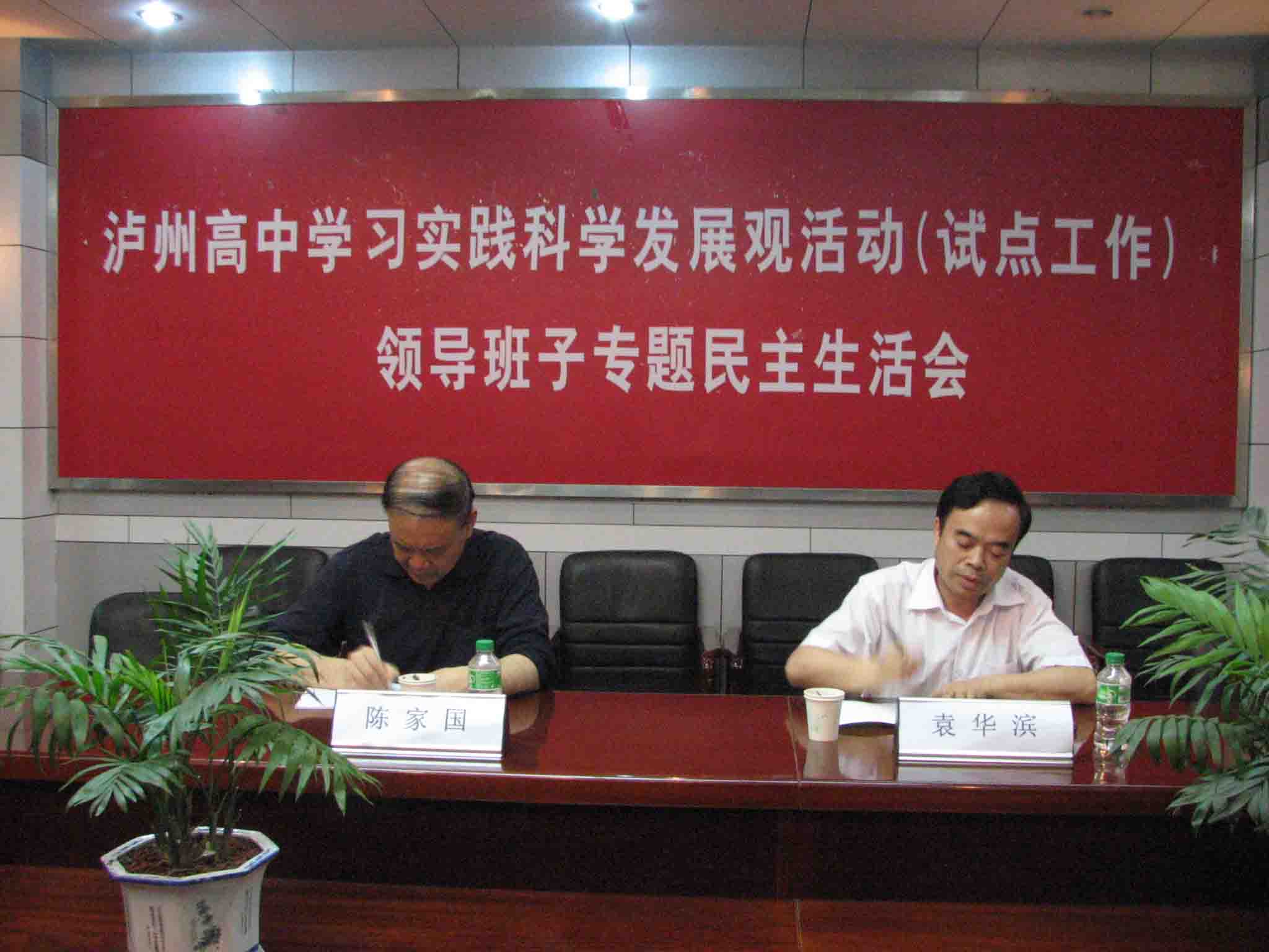 根據(jù)學(xué)習(xí)實(shí)踐科學(xué)發(fā)展觀活動(dòng)的要求,6月9日,瀘州高中召開學(xué)校班子專題民主生活會(huì),學(xué)校中層干部列席會(huì)議,市教育局黨委書記、局長袁華濱到會(huì)作指導(dǎo),并提出殷切希望。為了解決工學(xué)矛盾,民主生活會(huì)安排在晚上進(jìn)行。
