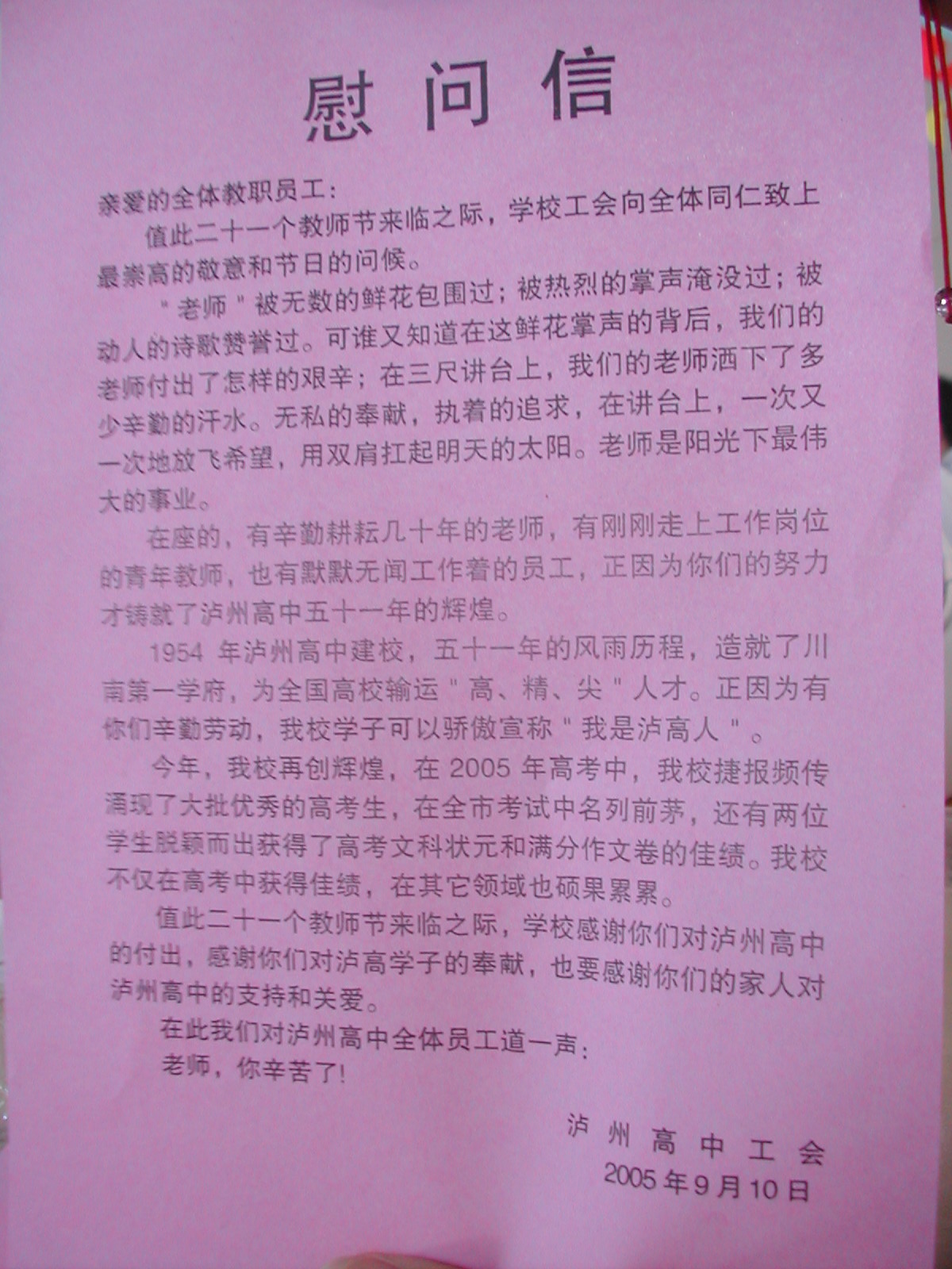 值此二十一個(gè)教師節(jié)來臨之際,學(xué)校感謝你們對(duì)瀘州高中的付出,感謝你們對(duì)瀘高學(xué)子的奉獻(xiàn),也要感謝你們的家人對(duì)瀘州高中的支持和關(guān)愛。在此我們對(duì)瀘州高中全體教職員工道一聲:老師,你辛苦了!