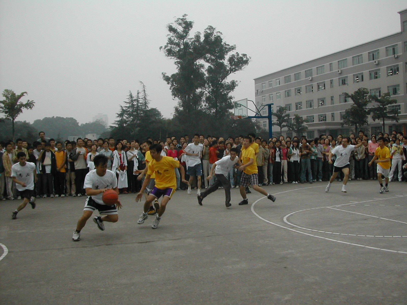 10月1 2日下午5:00在六三籃球場(chǎng)舉行的開(kāi)幕式。各隊(duì)統(tǒng)一服裝,隊(duì)員精神飽滿(mǎn),觀看的學(xué)生們熱情高漲,下課鈴一響,學(xué)生們?cè)缭绲貒盟共煌āi_(kāi)幕式由工會(huì)副校長(zhǎng)、副主席趙曉林主持,副校長(zhǎng)、工會(huì)主席王曉云講話(huà),校黨總支書(shū)記、校長(zhǎng)肖林為競(jìng)賽活動(dòng)開(kāi)球,肖校長(zhǎng)一個(gè)分球,贏得掌聲。比賽開(kāi)始了,由高一年級(jí)男隊(duì)對(duì)高二年級(jí)男隊(duì),高一年級(jí)女隊(duì)對(duì)高三年級(jí)女隊(duì)。比賽精彩激烈,老師、學(xué)生一齊吶喊加油助威,比賽達(dá)到高潮時(shí),有位老師情不自禁,拿起話(huà)筒當(dāng)起了義務(wù)解說(shuō)員。比賽結(jié)果,高一男隊(duì)勝高二男隊(duì),高三女隊(duì)勝高一女隊(duì)。