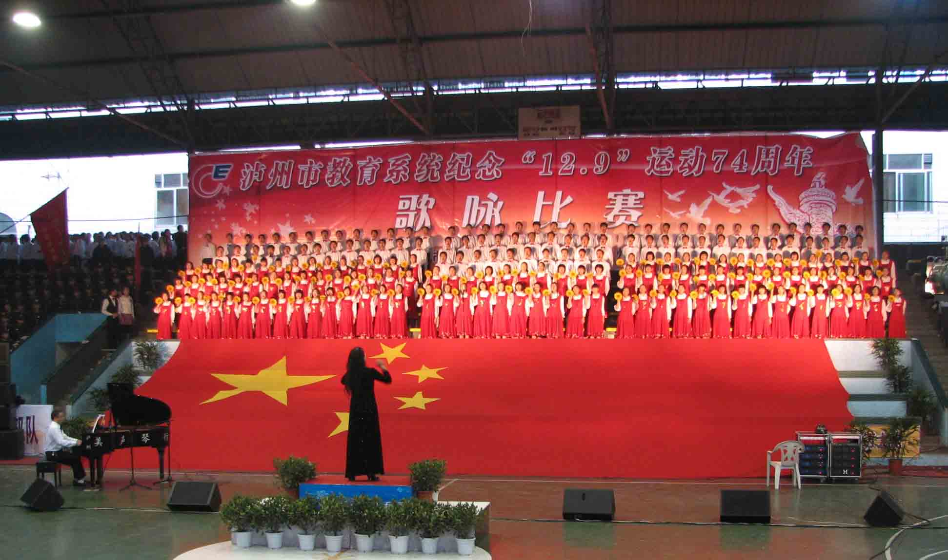 12月5日,在我市教育系統(tǒng)紀(jì)念“12·9”運(yùn)動(dòng)74周年歌詠比賽中,瀘州高中高一年級200名同學(xué)組成的合唱團(tuán)演唱《保衛(wèi)黃河》和《親吻祖國》兩首參賽歌曲,以99.3分的優(yōu)異成績位居所有參賽代表隊(duì)之首獲特等獎(jiǎng),學(xué)校獲優(yōu)秀組織獎(jiǎng),王琛老師獲最佳指揮獎(jiǎng)、龍小海老師獲最佳伴湊獎(jiǎng)。(完)