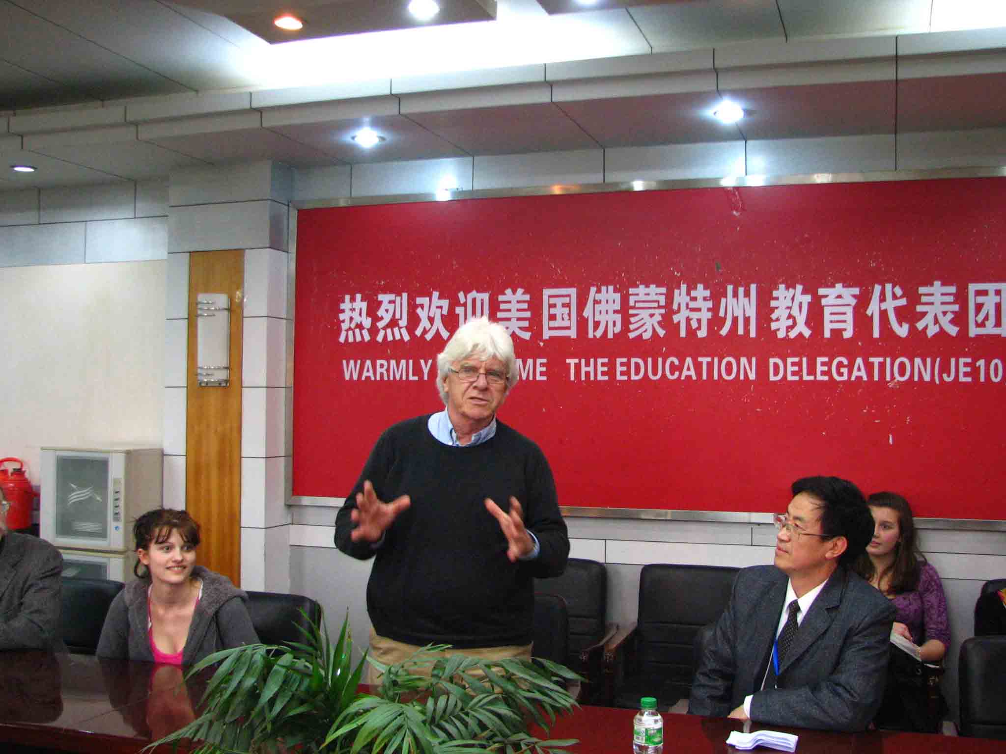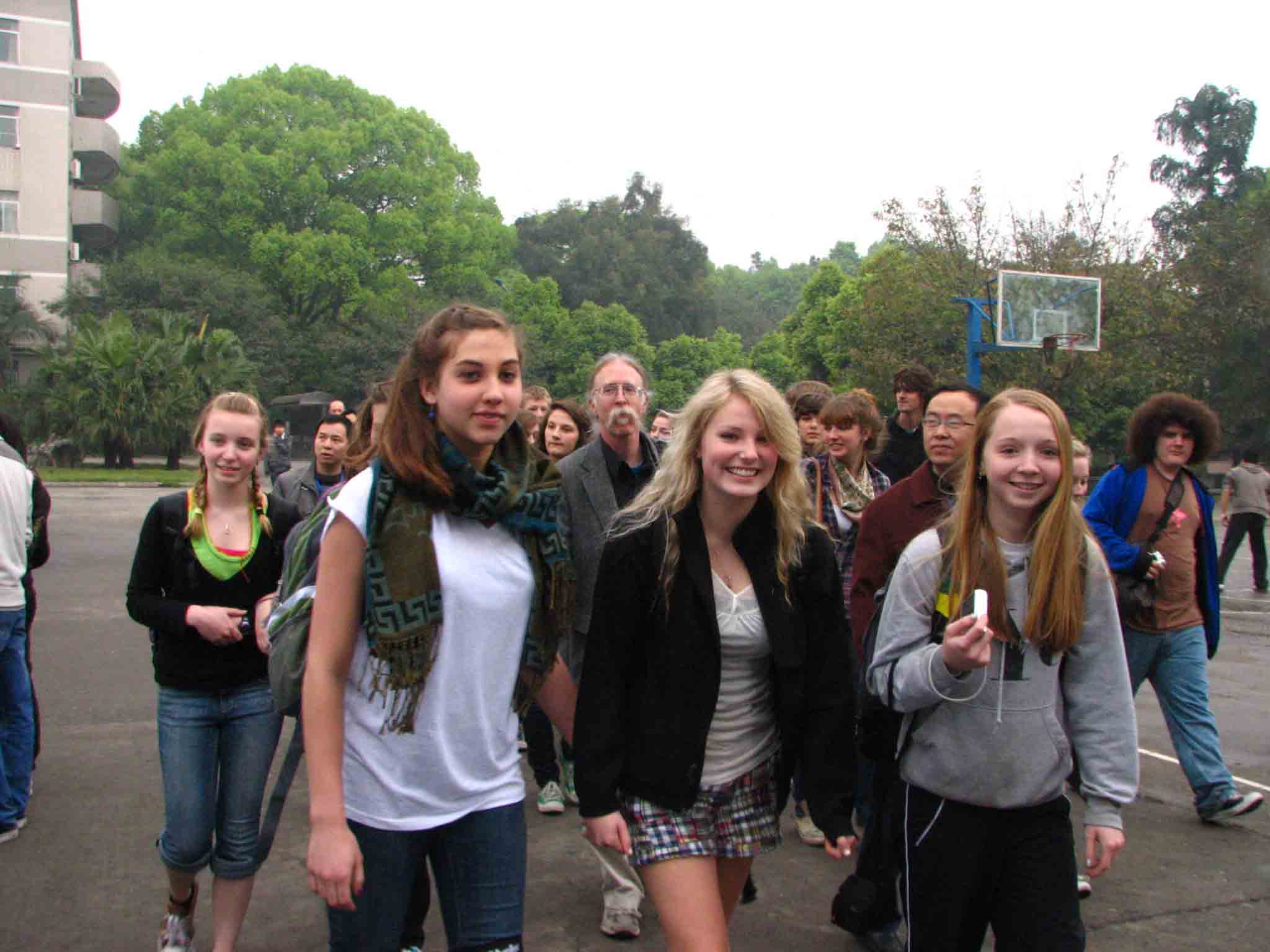 在歡迎儀式上,瀘高領(lǐng)導(dǎo)向林蘭格瑞的師生介紹了四川是大熊貓的故鄉(xiāng),瀘州以老窖酒聞名,瀘州高中是四川一流的國家級重點學(xué)校。在喜悅的氣氛中,林蘭格瑞的師生們參觀了瀘高校園環(huán)境和文化展覽室,稱贊瀘高環(huán)境優(yōu)美,空氣清新,校風(fēng)文明,是學(xué)習(xí)的天堂。代表團師生們還走進瀘課堂,與瀘高師生深入交流環(huán)保問題,大家一致認為,地球為人類所共有,保護地球是人類共同的責(zé)任。當(dāng)代表團領(lǐng)隊湯姆·卡納爾了解到瀘州高中正創(chuàng)建國家級綠色學(xué)校,師生志愿者們致力于開展環(huán)保宣傳教育、義務(wù)植樹、節(jié)水節(jié)電、長江生態(tài)調(diào)查、環(huán)保國際交流等方面的活動時,湯姆先生的雙手由衷地翹起了大拇指。瀘林兩校的學(xué)生精神飽滿,非?;钴S,互相都有交流不完的話題。在教學(xué)活動中,美國客人發(fā)現(xiàn)瀘高學(xué)生的英語水平高,不僅善于用英語與他們對話,還能用英語與他們同唱一首歌,表達共同的心聲和信念。