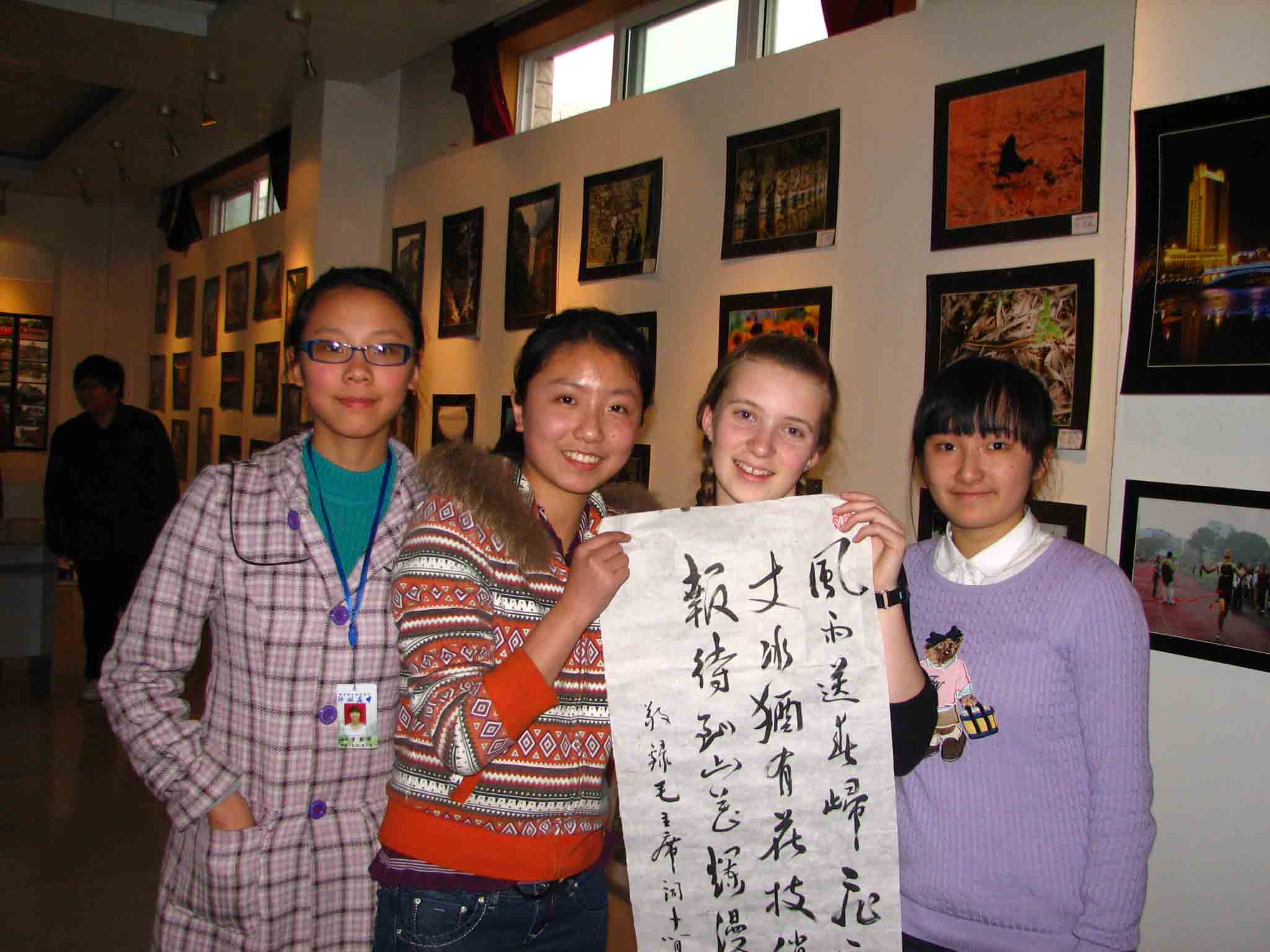 林蘭格瑞的師生對中國的書法繪畫、民族服飾、古鎮(zhèn)建筑、傳統(tǒng)工藝和酒文化等特別感興趣。有的學(xué)生向瀘高學(xué)生請教書法、繪畫,索要作品。瀘高學(xué)生則大展才藝,除手把手教客人認識漢字、書寫漢字外,還現(xiàn)場創(chuàng)作書畫作品送給客人。林蘭格瑞的一名女生布蘭迪愛好廣泛,她在民族服飾展臺面前流連忘返,向瀘高教師請教了很多問題,并戴上飾品與模特合影。布蘭迪還喜歡中國歷史,尤其是中國近現(xiàn)代史,她知道毛澤東和蔣介石,但更喜歡毛澤東。她