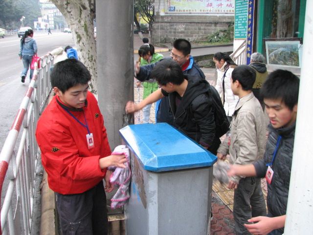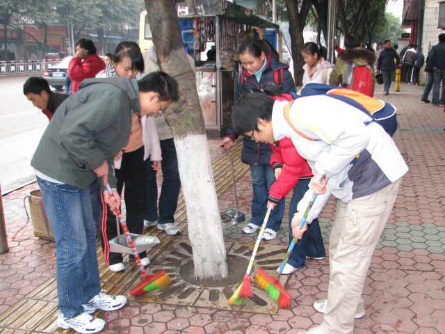 學(xué)校師生到在街道打掃衛(wèi)生。