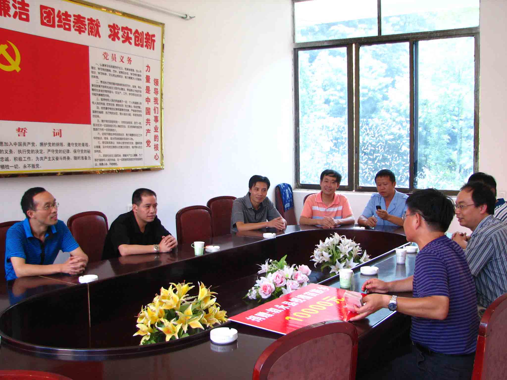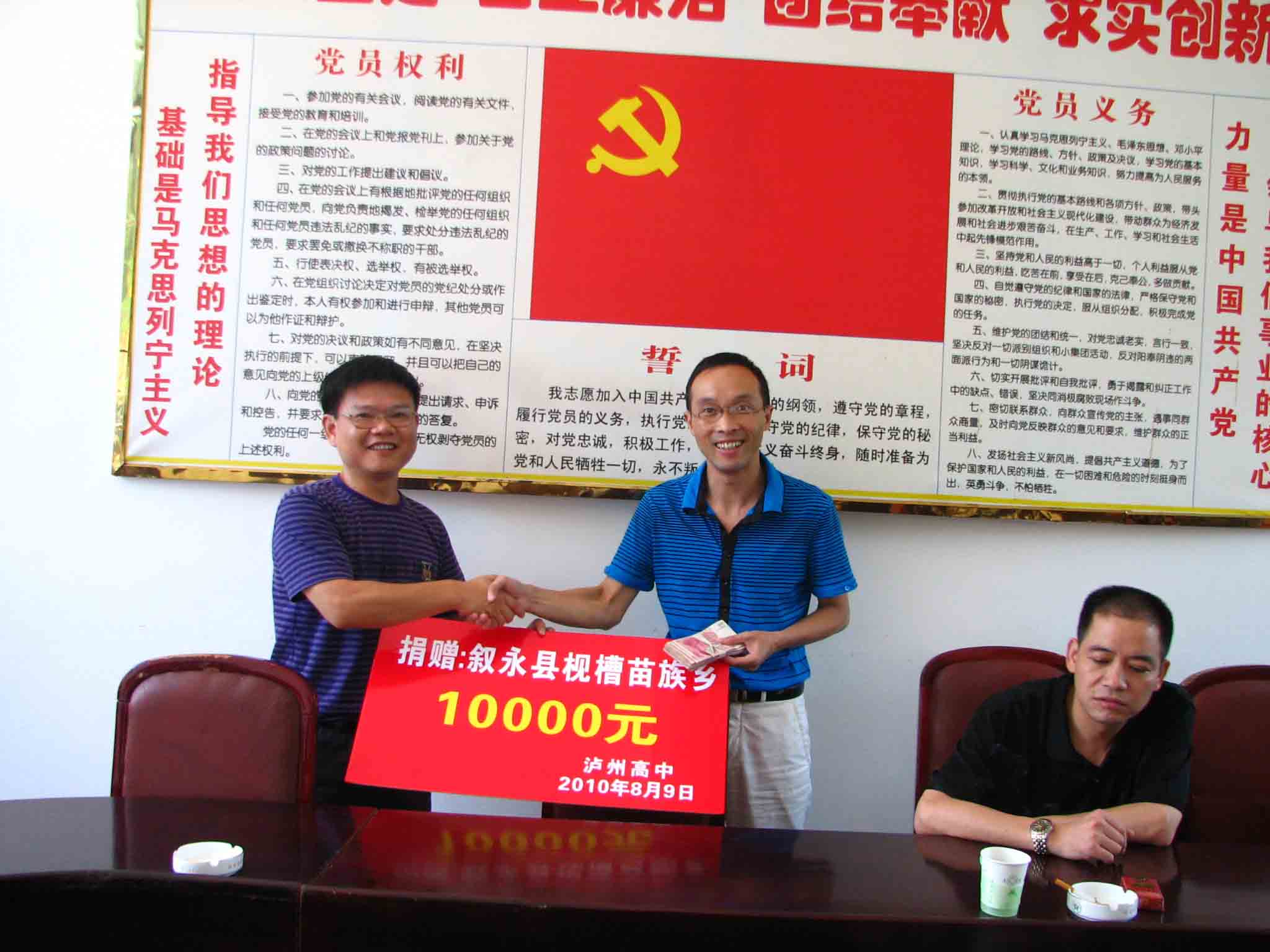 圖為枧槽鄉(xiāng)鄉(xiāng)長向軍(中)從李渝江(左一)手里接過瀘州高中1萬元扶貧資金。右一為枧槽鄉(xiāng)黨委書記。
