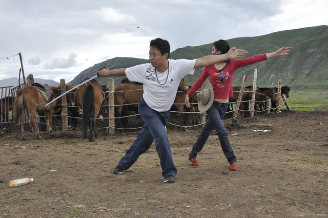 兩天過后,結(jié)古鎮(zhèn)的學(xué)生們?cè)诓菰蠟橹Ы汤吓e行了歡送儀式。正值草原最美好的季節(jié),太陽明麗,草地鮮綠,天很藍(lán),云很白。在藍(lán)天白云下,學(xué)生同樣以唱歌跳舞、喝青稞酒的最好禮節(jié)表達(dá)對(duì)老師的由衷敬意。