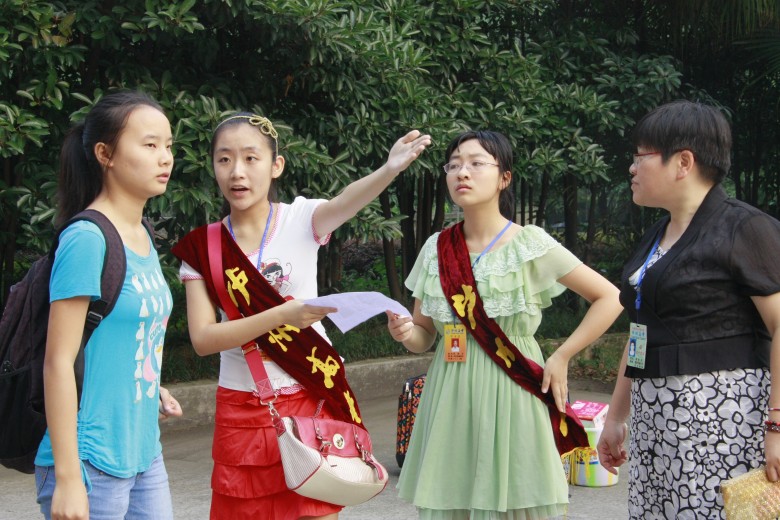 “請(qǐng)問,我在哪個(gè)班?。俊薄暗焦⒃趺醋??”“教室在哪里呢?”到學(xué)校報(bào)到的新同學(xué)走到詢咨臺(tái)詢問。在咨詢臺(tái)服務(wù)的都是即將進(jìn)入高二、高三的學(xué)長(zhǎng)們。面對(duì)詢問,他們總是面帶微笑,親切說話,用標(biāo)準(zhǔn)的手勢(shì)指示學(xué)弟學(xué)妹們要去的地方。