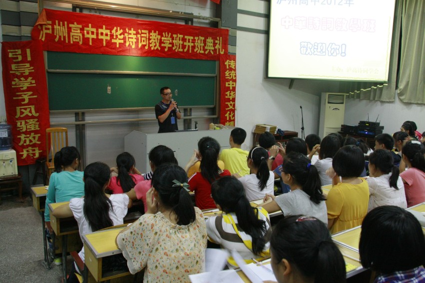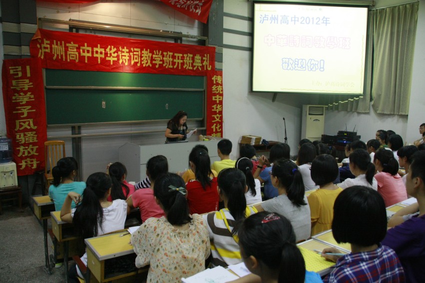 王曉英在賀詞中闡明了舉辦中華詩詞班的目的任務(wù),就是要致力于中華傳統(tǒng)文化教育,傳承我國優(yōu)秀文化傳統(tǒng)中最精髓的部分;主要是學(xué)習(xí)鑒賞古代優(yōu)秀作品,學(xué)會(huì)創(chuàng)作楹聯(lián),學(xué)習(xí)傳統(tǒng)詩詞創(chuàng)作手法。同時(shí)還介紹了瀘高詩詞教育所取得的豐碩成果,唐漢霖參加高考用古體詩作文獲滿分、唐志憑借良好的詩詞功底獲專業(yè)考試全國第一考入中央戲劇學(xué)院戲文系研究生,他們都曾是詩詞班的學(xué)員。“只要大家勤奮努力,或許就能圓自己未來做詩人、當(dāng)作家的夢想?!?/SPAN>