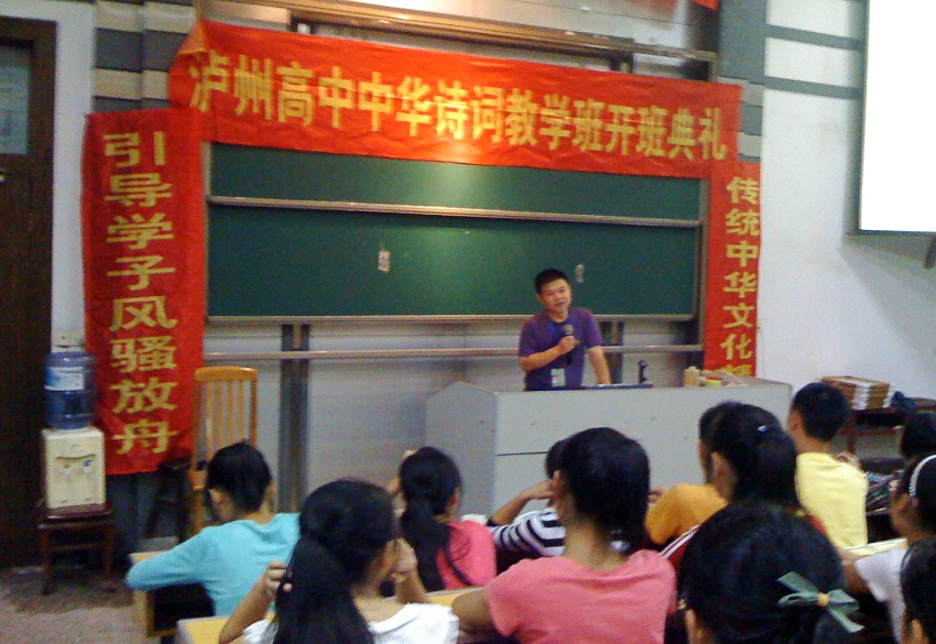李渝江在賀詞中用“欣賞、羨慕、敬佩、期待”八個(gè)字來勉勵(lì)詩詞班的同學(xué)們。他作為理科教師非常欣賞同學(xué)們能作詩填詞;他作為讀著“文革”詩長大的人非常羨慕同學(xué)們能寫出典雅的傳統(tǒng)詩詞,同時(shí)也非常羨慕同學(xué)們有懂詩詞、樂于奉獻(xiàn)的老師作輔導(dǎo);他敬佩同學(xué)們不受高考應(yīng)試的現(xiàn)實(shí)功利影響,而發(fā)自內(nèi)心地?zé)釔圩屪约阂惠呑邮芤娴膫鹘y(tǒng)詩詞;他期待同學(xué)們堅(jiān)守對傳統(tǒng)詩詞的愛好,創(chuàng)作出許許多多的優(yōu)秀作品,為瀘高的校園文化建設(shè)作貢獻(xiàn),為瀘州市歷史文化名城的文化繁榮發(fā)展作貢獻(xiàn)。