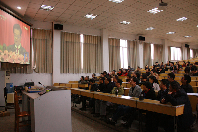 為了完整收看這一全黨、舉國(guó)盛會(huì),許多沒(méi)有課的黨員早早就來(lái)到了學(xué)術(shù)報(bào)告廳等候,有課的黨員課上完后也隨即趕到。在收看過(guò)程中,所有黨員干部?jī)A耳聆聽(tīng),喜悅激動(dòng)的情緒與胡總書(shū)記的報(bào)告內(nèi)容和人民大會(huì)堂的氛圍相起伏。收看過(guò)后,一些黨員干部忙著把報(bào)告內(nèi)容傳遞給因工作未收看的黨員教職工,并分享自己的感受。