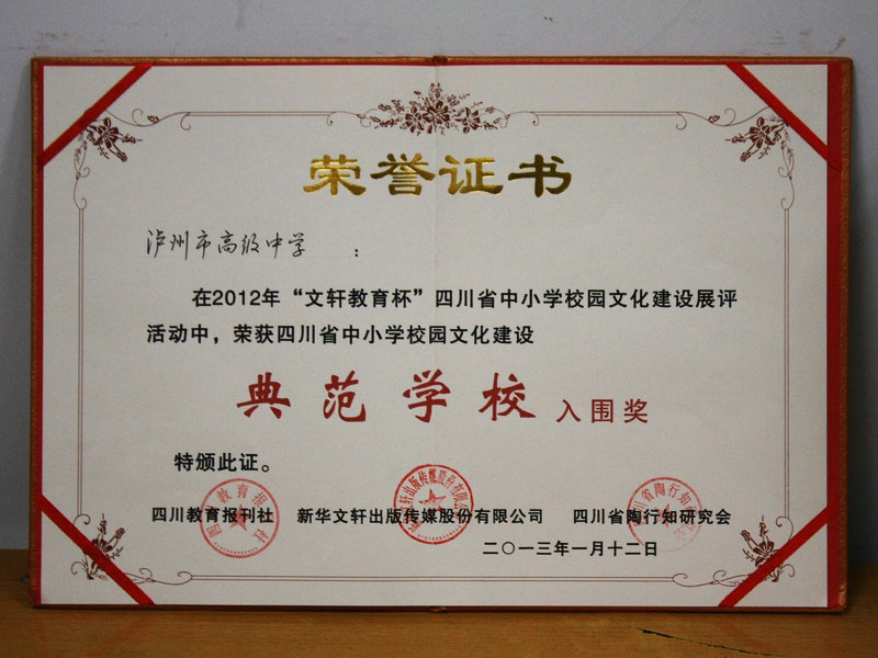 在2012年“文軒教育杯”校園文化建設(shè)展評活動中,瀘州高中被評為四川省中小學(xué)校園文化建設(shè)典范學(xué)校入圍學(xué)校。該活動由四川教育報(bào)刊社、新華文軒出版?zhèn)髅焦煞萦邢薰尽⑺拇ㄊ√招兄芯繒鬓k。(古幫倫)