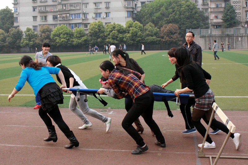 運動會競賽項目有接力跳大繩、兩人三足40米迎面接力、齊心協(xié)力40米迎面接力、足球定位射門、40米接力救助傷員行動等5個項。這些運動項目都需要運動員團隊協(xié)調配合才能創(chuàng)造佳績。最讓人叫得響的是“40米接力救助傷員行動”項目, 6名隊員將空單架迅速抬到目標地把“傷員”迅速抬回出發(fā)點,不僅趣味性強,還讓參賽隊員和觀眾學到了緊急救助傷員的技能。