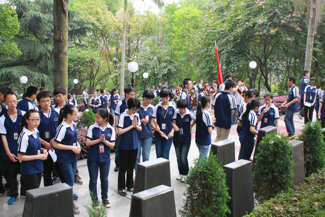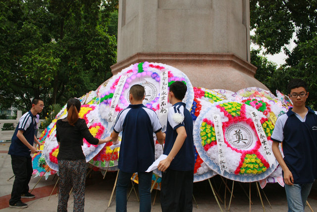 瀘高的學(xué)生以無(wú)比沉重的心情把花圈和盆景敬獻(xiàn)在高大的烈士墓碑前,把一朵朵白花系在綠色的樹(shù)枝上。他們?cè)诹沂苛陥@低首徘徊,靜靜駐立,向鐫刻有烈士名字的墓碑默默鞠躬或是雙手合十。