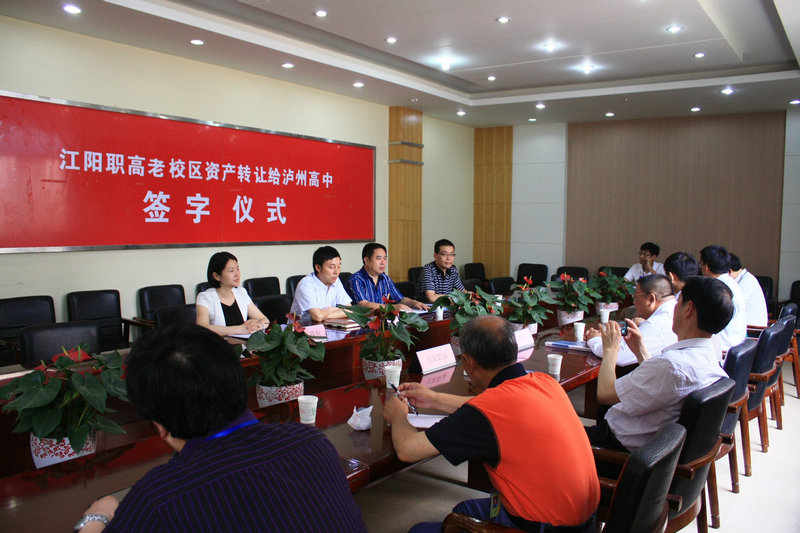 5月24日,瀘州高中校長肖林與江陽職高校長李代慧在瀘州高中行政樓大會議室簽字確定,江陽職高老校區(qū)資產(chǎn)轉讓給瀘州高中。出席簽字儀式的有市教育局副局長許建國,江陽區(qū)副區(qū)長王一米,江陽區(qū)教育局局長楊華福,瀘州高中副校長李渝江、劉中楷、何明英等有關領導干部。簽字儀式由許建國主持。