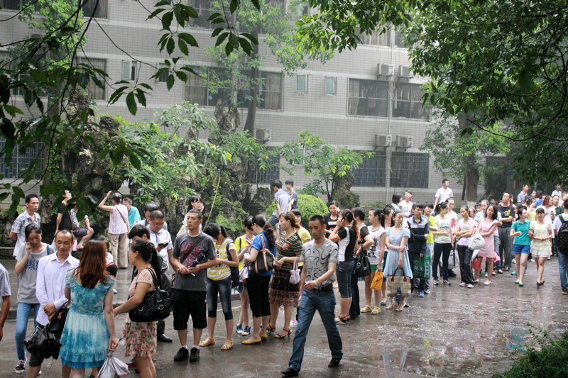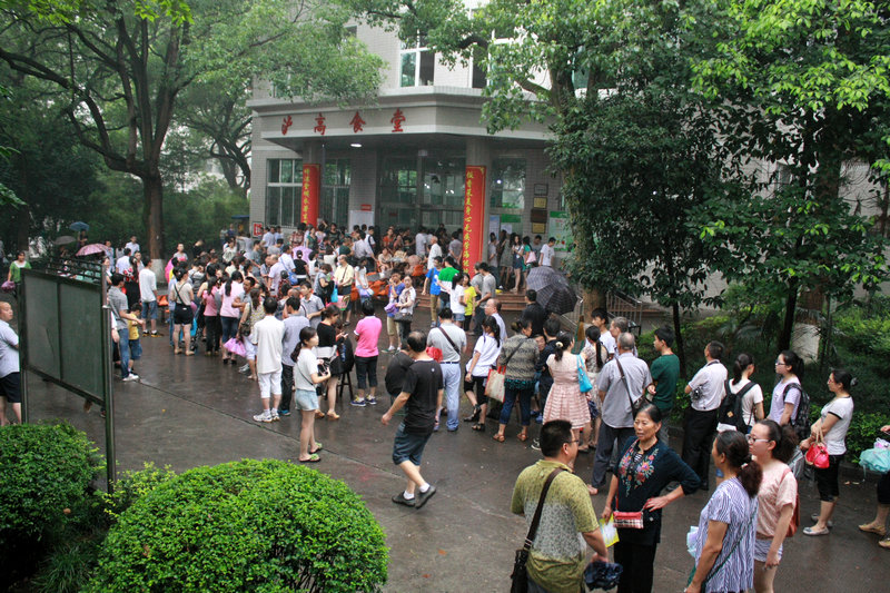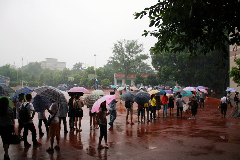 報名地點安排在瀘高食堂,許多學生、家長在昨夜暴雨前就開始排隊了。暴雨來臨時,他們只作了短暫的疏散,暴雨過后他們又打著雨傘排好隊等待報名時間的到來。早晨8時許,報名時間到來了,他們已排成了200多米的“長龍陣”。