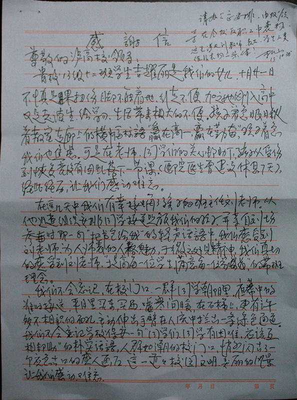 10月31日,瀘州高中副校長李渝江收到一封來自一名學生父母的感謝信,李渝江拆開粉紅色的信封,取出書信看完后用筆批示:請辦公室安排,由校領導在教職工大會中宣傳信中所反映的先進事跡,并就其中關(guān)愛他人,奉獻愛心的師生員工給予表揚。