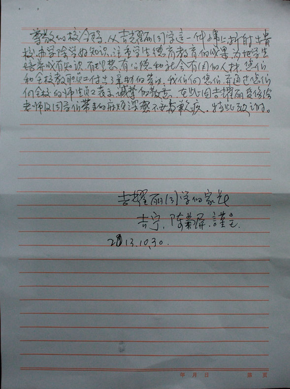 家長最后寫道:尊敬的領導,從吉耀麗同學這一件小事上折射出,貴校辦學除要學生學好知識外,還注重學生德育教育。為了把學生培養(yǎng)成為有知識,有理想,有道德和對社會用的人材,你們和全校教職員工付出了辛勤的勞動。我們向你們,并通過你們向全校的師生員工表示誠摯的敬意。在此,因吉耀麗受傷給老師及同學們帶來的麻煩深感不安與歉疚,特此致謝。
