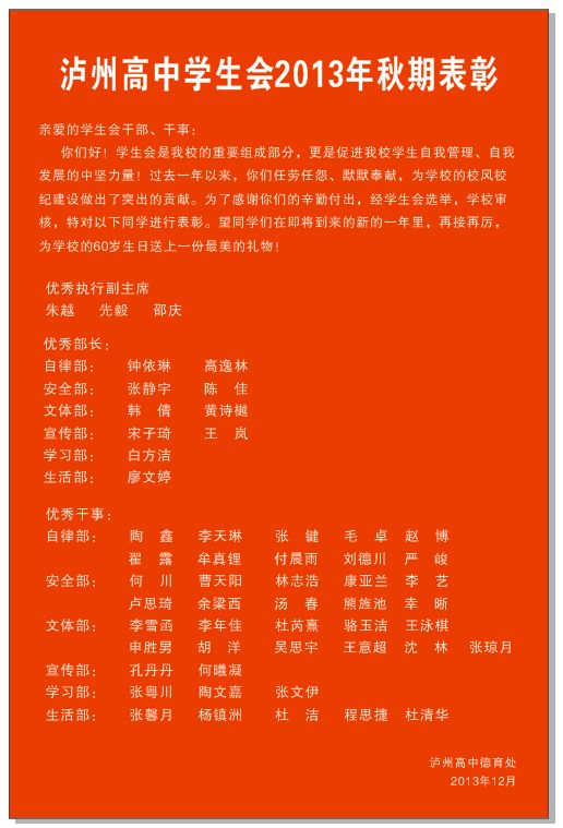2013年秋期學(xué)生會優(yōu)秀干部光榮榜