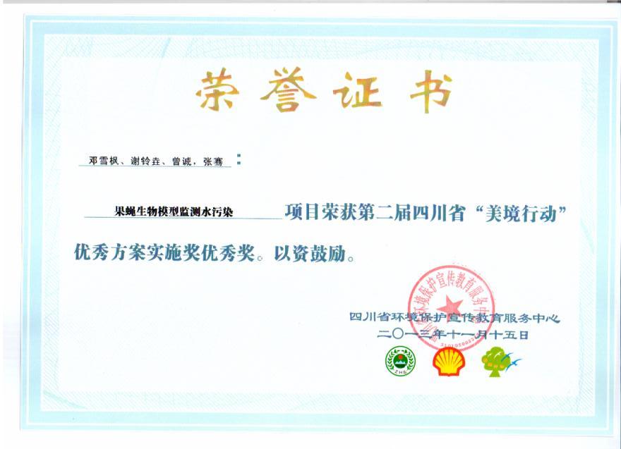 11月15日,四川省環(huán)境保護(hù)宣傳教育服務(wù)中心舉行第二屆四川省“美境行動”評選活動,瀘州高中所提交的改善身邊環(huán)境項目實施方案,有1項獲二等獎、2項獲優(yōu)秀獎。學(xué)校獲優(yōu)秀組織獎。(古邦倫)