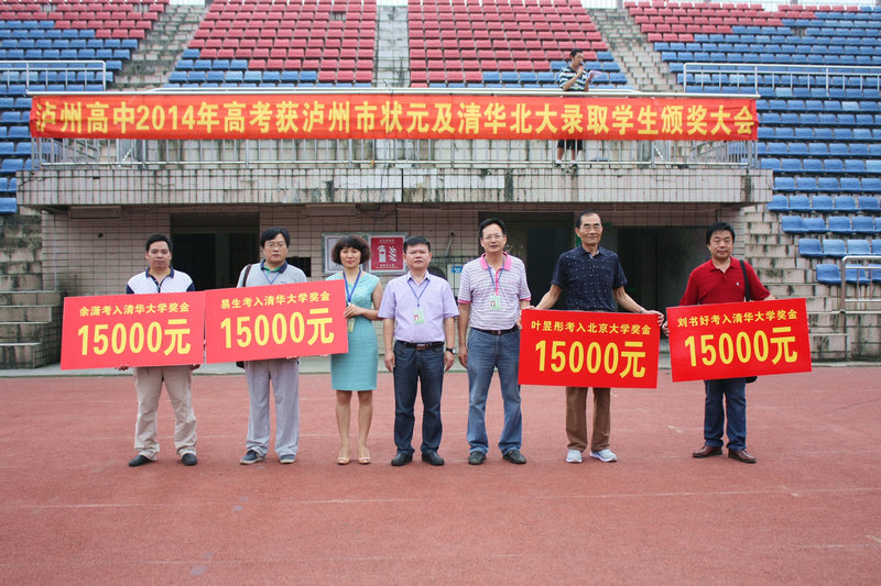 9月9日,瀘州高中用隆重的儀式,向今年考入清華北大的3名全市理科狀元易生、余瀟、葉昱彤和1名美術(shù)特長生劉書好各頒發(fā)獎金1.5萬元。