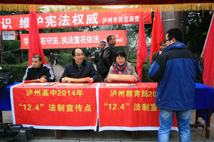 12月4日,是我國首個憲法日,瀘州高中黨委書記、校長李渝江和紀(jì)委書記羅德強(qiáng)帶領(lǐng)教職工在大梯步文化廣場設(shè)置宣傳臺,開展宣傳活動?;顒又?,向行人散發(fā)彩印宣傳資料,講解有關(guān)憲法和法律知識,幫助行人解讀《中共中央關(guān)于全面推進(jìn)依法治國若干重大問題的決定》。(古邦倫)