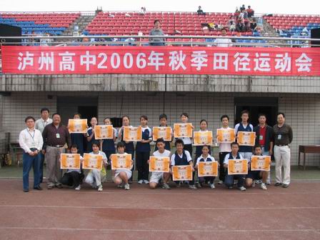 在運(yùn)動(dòng)會閉幕式上,肖校長作了閉幕講話,校長們?yōu)楂@得年級前8名的班級頒了獎(jiǎng)。在 這次運(yùn)動(dòng)中全校有6人一隊(duì)打破了13項(xiàng)校紀(jì)錄,7人一隊(duì)打破了10項(xiàng)年級紀(jì)錄。其中,高三、3班的夏路杰繼去年打破100米、200米、400米校記錄后,今年再次打破以上三項(xiàng)校紀(jì)錄;高三、2班的沈雪梅繼去年打破400米、800米、1500米校紀(jì)錄后,今年也打破了上述三項(xiàng)校紀(jì)錄;高三、12班的柯華再次打破跳高、三級跳遠(yuǎn)兩項(xiàng)校紀(jì)錄;高二、12班的甘小平打破1500米、3000米兩項(xiàng)校紀(jì)錄和一項(xiàng)年級紀(jì)錄;高二、9班的范霞打破了女子1500米校紀(jì)錄。