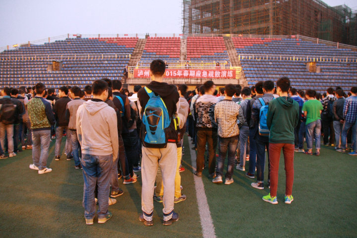 3月19日清晨,隨著一聲警報(bào)嘶鳴,2000多名瀘州高中住校生便快速?gòu)膶嬍掖髽潜寂艿竭\(yùn)動(dòng)場(chǎng)站成方陣。這是瀘州高中以火災(zāi)為背景舉行的逃生疏散演練。