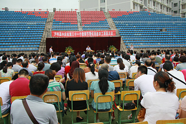 9月10日,第三十一個教師節(jié),瀘州高中舉行盛大典禮,隆重表彰全國師德標兵江紅梅,省優(yōu)秀教師宋永平,“4.20”蘆山強烈地震災后援建先進個人蔣毅;同時還表彰了校級優(yōu)秀教師54人,優(yōu)秀班主任24人,優(yōu)秀備課組長15人,優(yōu)秀教研組長4人,教壇新秀9人,服務之星20人;并向3名退休教師頒發(fā)紀念品。