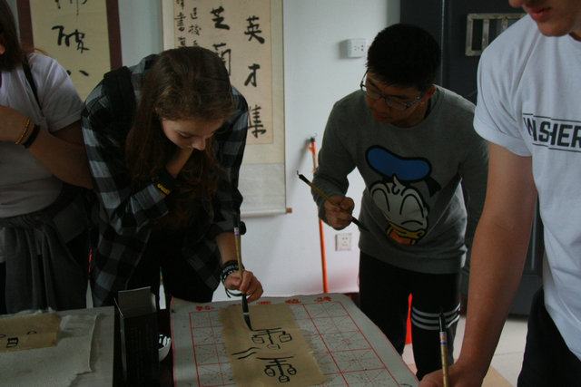皮卡特的師生來到瀘州高中詩書畫室,看到一件件書法藝術(shù)品,便引發(fā)了學(xué)習(xí)書法的興趣。有的學(xué)生學(xué)習(xí)用毛筆書寫漢字篆文。