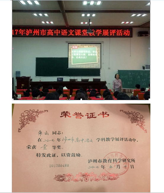 2017年5月9號至10號在合江中學舉行了瀘州市語文學科展評課活動。從瀘州市各縣區(qū)和直屬校通過層層選拔的11位優(yōu)秀青年教師同臺競技。瀘州高中教師朱云所授的《祖孫之間》一課以前沿的課改理念、精心的教學設計、流暢的教學操作、精彩的師生活動得到評委和觀摩教師的一致好評,點評專家形容朱老師的課“補充標題激漣漪,文句品讀揣心理,對話充分出深意,環(huán)環(huán)緊扣揭主題”。經(jīng)過最終評審,朱云老師榮獲瀘州市一等獎。