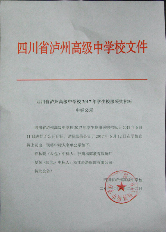 四川省瀘州高級(jí)中學(xué)校2017年學(xué)生校服采購招標(biāo)于2017年6月11日進(jìn)行了公開開標(biāo),評(píng)標(biāo)結(jié)果公告于2017年6月12日在學(xué)校官網(wǎng)上發(fā)出,現(xiàn)將中標(biāo)人名單公示如下: