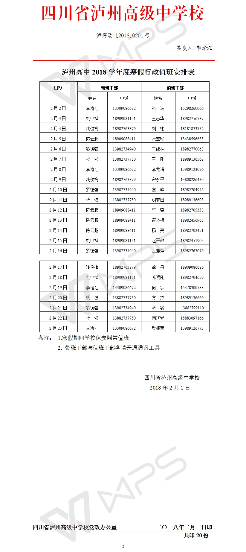 瀘州高中2018學(xué)年度寒假行政值班安排表