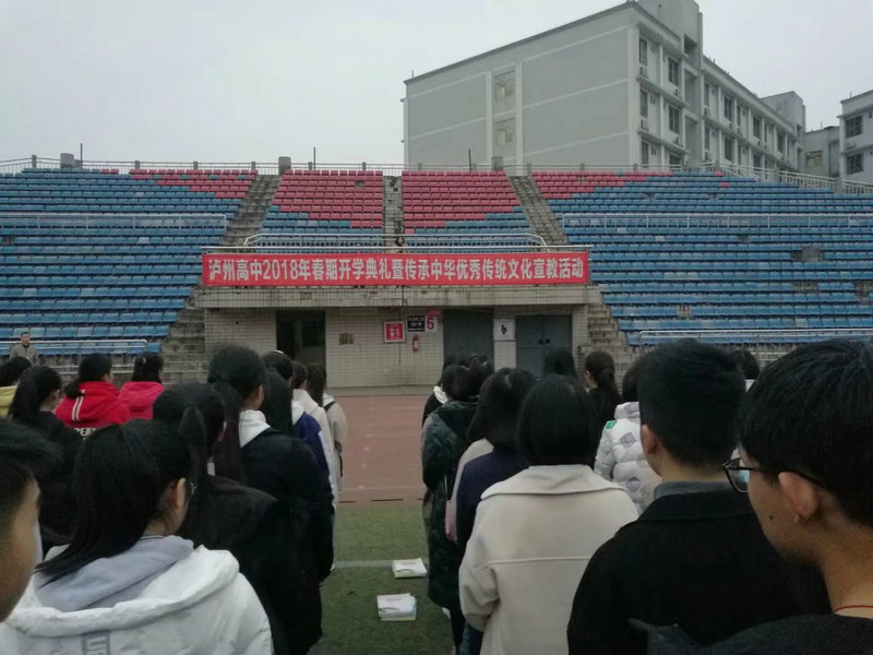 2月26日,春期開學(xué)第一天的清早,瀘高7000多名師生齊聚廣場舉行開學(xué)典禮。主席臺上一幅印有“傳承中華優(yōu)秀傳統(tǒng)文化宣教活動”的標(biāo)語格外醒目。升旗儀式過后,副校長陶俊梅以“承優(yōu)秀傳統(tǒng)文化,展名校學(xué)子風(fēng)采”為題作報告。