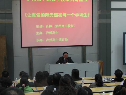 2007年11月22日晚,在瀘州高中演講廳舉辦了瀘州高中家長學(xué)校系列講座(五)。高2010級(jí)和2009級(jí)部分家長參加了培訓(xùn)。瀘州高中黨總支書記兼校長肖林作了題為《讓真愛的陽光照亮每一個(gè)學(xué)困生》精彩的講座。 肖校長從學(xué)困生的定義入手,介紹了學(xué)困生的表現(xiàn),分析了成因,重點(diǎn)介紹了家長應(yīng)對(duì)的策略。同時(shí)肖校長還向各位家長介紹了家校合作的必要性,并倡導(dǎo)各位家長更新育人觀念,更多關(guān)愛學(xué)困生,真切地關(guān)心他們健康的成長。與會(huì)家長深受啟發(fā),會(huì)后部分家長針對(duì)自己子女存在的問題與肖校長作了長時(shí)間的交流。2007年11月22日晚,在瀘州高中演講廳舉辦了瀘州高中家長學(xué)校系列講座(五)。高2010級(jí)和2009級(jí)部分家長。