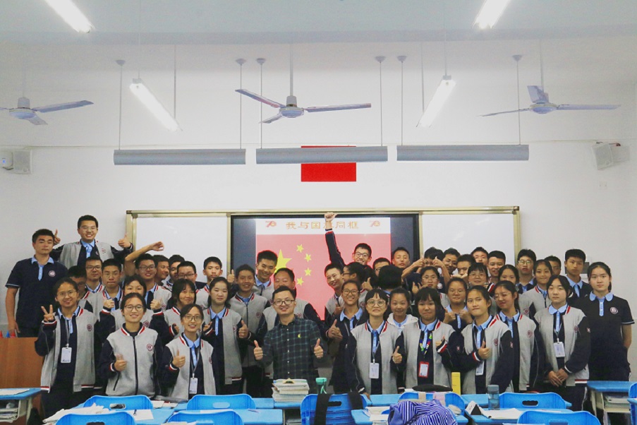 課堂上的愛國主義:主題班會由班級團支書或組織委員組織,班級主要團干部按要求佩戴團徽參加活動,其余同學全體著校服,校德育處統一發(fā)放慶祝中華人民共和國70周年PPT。全體師生學習新中國發(fā)展史,銘記新時代重任,齊唱《我和我的祖國》,并進行了“我與國旗同框”拍攝活動。我們肩上的擔子無比艱巨,我們肩負的使命無比光榮,在這個屬于奮斗者的新時代,人人都是追夢人,人人也都是夢想大廈的筑造者。