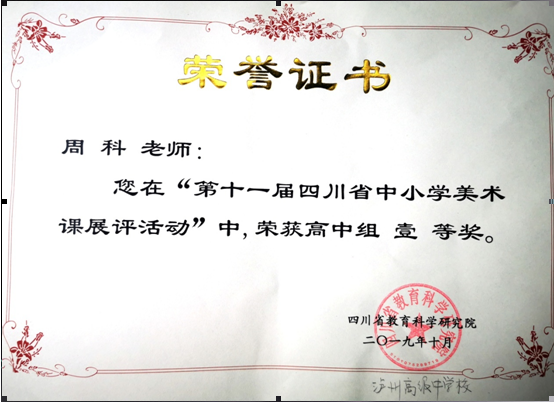 滿城盡帶黃金甲 萬(wàn)類霜天競(jìng)自由 ——瀘州高中教師接連榮獲四川省比賽大獎(jiǎng) 金黃的深秋,收獲的季節(jié)。2019年10月,瀘州高中多位教師在四川省學(xué)科優(yōu)質(zhì)課競(jìng)賽、技能大賽中榮獲殊榮,這一成績(jī)?cè)俅握宫F(xiàn)了瀘高教師的優(yōu)秀素質(zhì)和瀘高團(tuán)隊(duì)的教學(xué)水平! 藝術(shù)組周科老師代表瀘州高中參加了2019年中小學(xué)美術(shù)課系列展評(píng)活動(dòng),經(jīng)過(guò)瀘州市直屬學(xué),F(xiàn)場(chǎng)賽課、瀘州市錄像課比賽、瀘州市現(xiàn)場(chǎng)課比賽、四川省錄像課比賽,最終榮獲“第十一屆四川省中小學(xué)美術(shù)課展評(píng)活動(dòng)”高中組一等獎(jiǎng)。并且,2019年11月,周科將受邀參加在北京舉行的中國(guó)教育學(xué)會(huì)第二屆課堂教學(xué)研討會(huì),在研討會(huì)上向來(lái)自全國(guó)的專家、學(xué)者、教研員和老師們展示《華夏意匠——中式園林造園》一課。