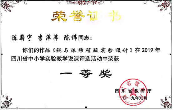 近日,從省教廳技術(shù)物資裝備管理指導(dǎo)中心獲息,我;瘜W(xué)組教師陳薪宇經(jīng)過(guò)精心準(zhǔn)備,在化學(xué)教研組周鳳、王輝、陳偉、聶志剛、趙宛霜、稅小蓉、鄧龍彬等教師的共同努力下,通過(guò)直屬校、瀘州市層層選拔,代表瀘州市在成都鐵路中學(xué)參加“2019年四川省中小學(xué)實(shí)驗(yàn)教學(xué)說(shuō)課大賽”,一路過(guò)關(guān)斬將,最終取得了省級(jí)一等獎(jiǎng)的好成績(jī)! 此次活動(dòng)由四川省教育廳主辦,經(jīng)過(guò)網(wǎng)絡(luò)初評(píng),全省共有169名教師取得參加現(xiàn)場(chǎng)實(shí)驗(yàn)教學(xué)說(shuō)課評(píng)選的資格。陳薪宇老師是全省高中化學(xué)學(xué)科四名一等獎(jiǎng)獲得者之一,也是瀘州市高中化學(xué)學(xué)科唯一的一等獎(jiǎng)獲得者。這不僅是我校教師綜合教育教學(xué)水平的鮮明展示,更是我校課堂改革取得顯著成果的一個(gè)縮影。 歷史組陳鑫老師在歷史優(yōu)質(zhì)課競(jìng)賽中,通過(guò)直屬校、瀘州市層層選拔,均以一等獎(jiǎng)第一名的成績(jī)勝出。在2019年10月在德陽(yáng)舉辦的四川省高中歷史優(yōu)質(zhì)課比賽中,陳鑫老師作為瀘州市參賽代表,與全省23名各市州一等獎(jiǎng)選手中同臺(tái)競(jìng)技,脫穎而出,最終以前十強(qiáng)的優(yōu)秀成績(jī)榮獲二等獎(jiǎng),并獲得參加全國(guó)歷史優(yōu)質(zhì)課比賽資格。