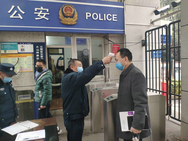 瀘州高中副校長、工會主席劉中楷在校門口讓保安測量體溫。