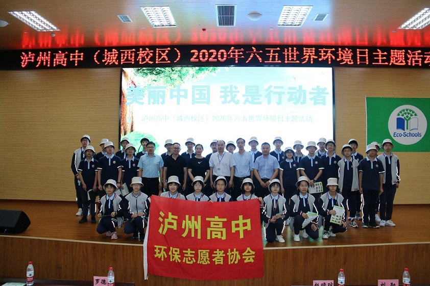五、瀘州高中城西校區(qū)高2019級環(huán)保志愿者協(xié)會成立,瀘州市生態(tài)環(huán)境局黨組成員、機(jī)關(guān)黨委書記趙曉瓊和瀘州高中紀(jì)委書記羅德強(qiáng)共同為瀘州高中環(huán)保志愿者協(xié)會授旗。