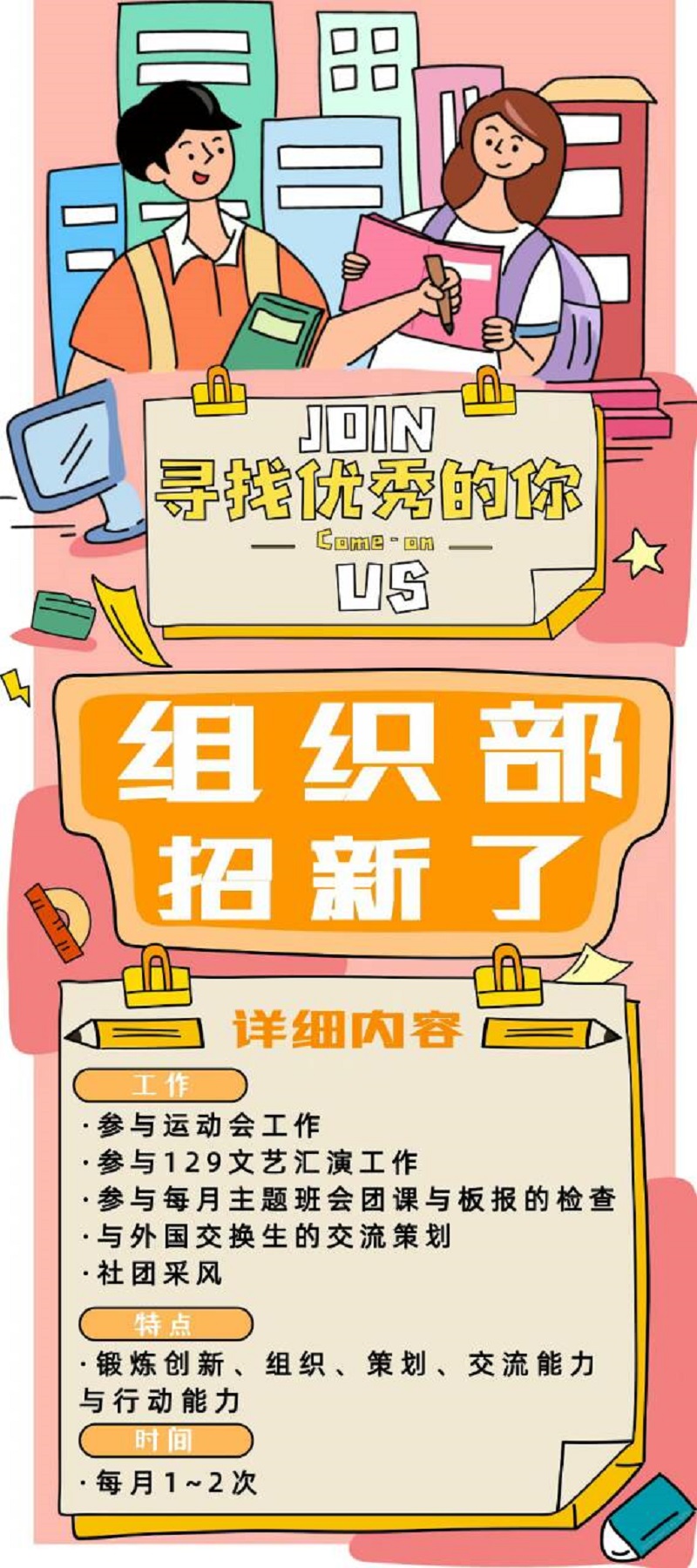 組織部:負責校團委各項活動的組織策劃和方案設計,參與運動會,129文藝匯演等大型活動的各項工作,參與每月主題班會團課和板報的檢查,并進行二次復查及記錄檢查情況。