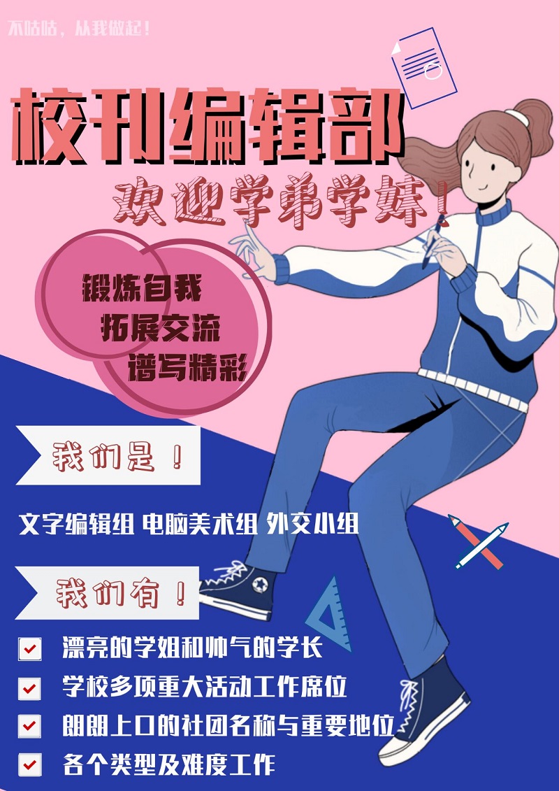 ??庉嫴?/SPAN>:校刊編輯部是校團委一個全新的部門,承載著老師殷切的希望,凝聚著成員必勝的決心,主要負責??妒R青語》的編輯工作,為文筆優(yōu)秀的同學提供一個平臺。