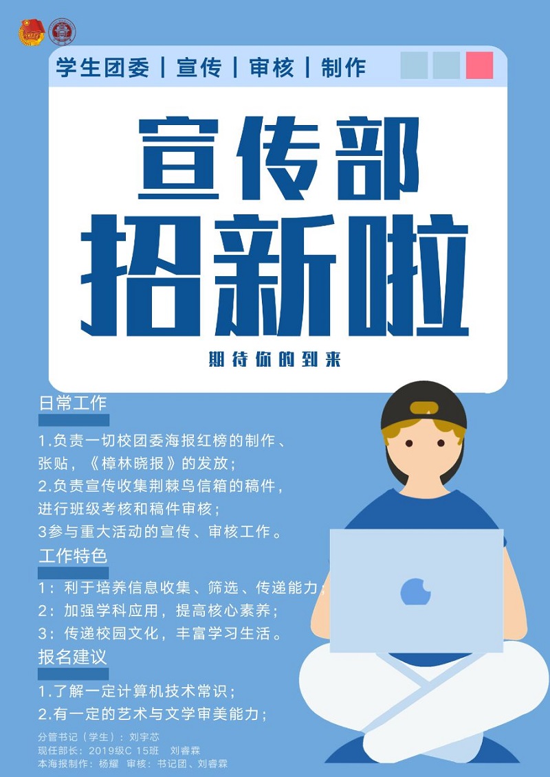 宣傳部:宣傳部是主管團委形象方面的綜合職能部門,也是展現(xiàn)學生創(chuàng)意和才華的舞臺,是凸顯學校特色和風采的窗口。主要負責校團委的整體形象宣傳,加強學校與學生之間的聯(lián)系。日常工作為繪制各種宣傳海報、展板,制作團課PPT,征集稿件,參加重要活動等等。