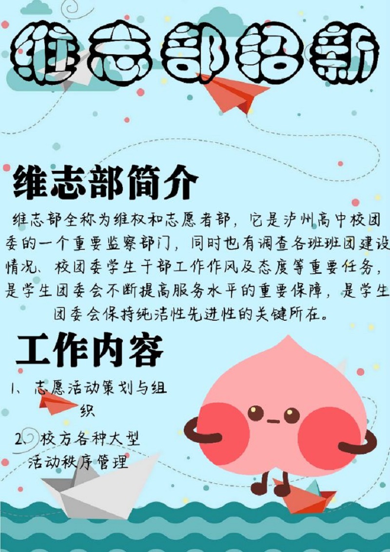 維志部: 維志部全稱為維權和志愿者部,它是瀘州高中校團委的一個重要監(jiān)察部門,同時也有調(diào)查各班班團建設情況,校團委學生干部工作作風及態(tài)度,策劃、組織、參與校園志愿者活動等重要任務,是學生團委會不斷提高服務水平的重要保障,是學生團委會保持純潔性先進性的關鍵所在。