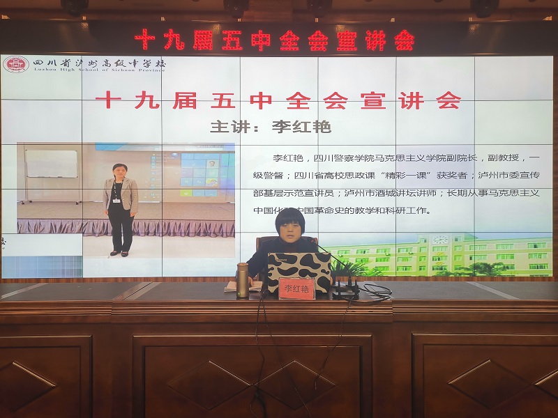 為進一步加強對十九屆五中全會精神的學習,按照市委宣傳部統(tǒng)一安排部署,12月7日下午,市委宣講團成員、四川警察學院馬克思主義學院副院長李紅艷教授蒞臨瀘州高中,向全校黨員宣講黨的十九屆五中全會精神。瀘州市教育和體育局副局長許多焱指導宣講落實工作,瀘州高中黨委書記、校長陳云超主持會議,全體黨員教師到場聆聽。