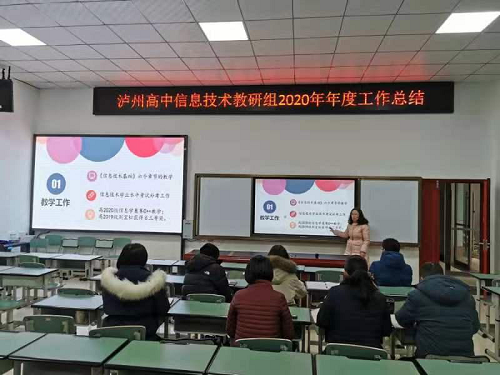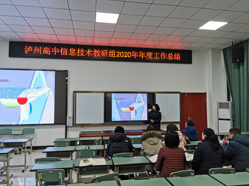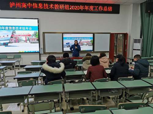 2021年1月18日,瀘州高中信息技術(shù)教研組在忠山校區(qū)致知樓108室進行了2020年年度總結(jié)會。本次會議由教研組長何兆強老師主持,首先強調(diào)了參會紀律,并嚴格考勤,會議始終在熱烈友好的氛圍中進行,既總結(jié)了這一年的成績、收獲也展望了未來的工作規(guī)劃和學科發(fā)展。