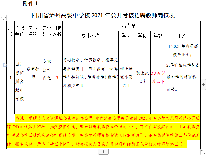 附件:1《四川省瀘州高級(jí)中學(xué)校2021年公開(kāi)考核招聘教師崗位表》 2.《四川省瀘州高級(jí)中學(xué)校公開(kāi)考核招聘教師報(bào)名表》