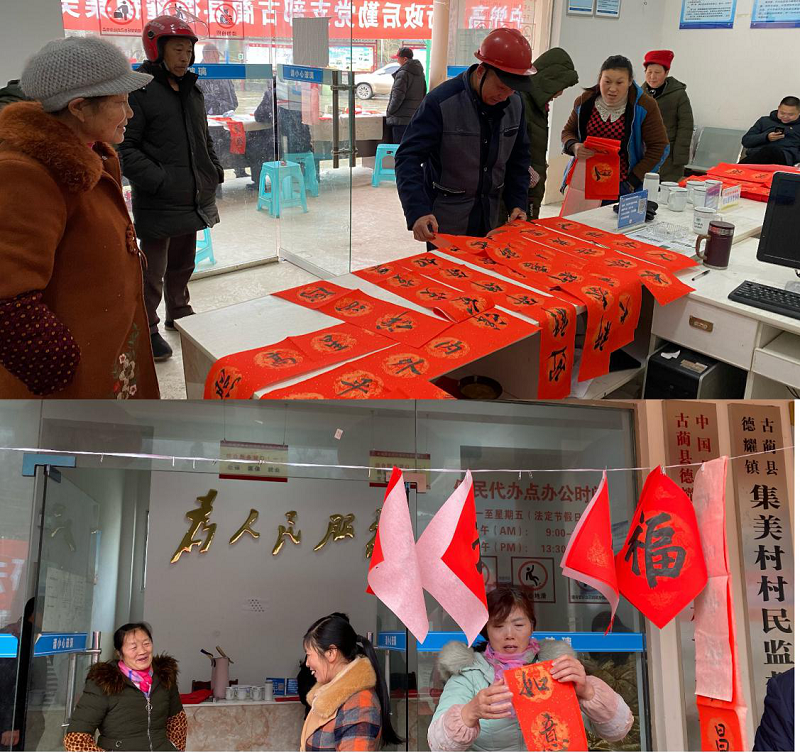 作春聯(lián)弘正氣見使命情懷。瀘州高中詩詞楹聯(lián)社林瑊老師即興為集美村創(chuàng)作對聯(lián)。“凝情聚暖儉持家福澤萬年,勠力同心勤為政德耀千古”、“晴光滿福地地匯人間溫情,淑氣迎新春村集天下和美”,不僅彰顯了兩單位之間的深厚友誼,還飽含著對黨和國家的熱愛、對新時代美好生活的憧憬,洋溢著新春的氣息。