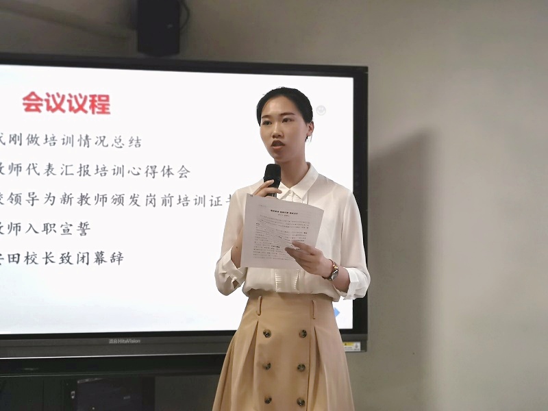 學(xué)員代表董靜怡發(fā)言。她以7天來(lái)的心路歷程為切入點(diǎn),用“興奮、緊張、警醒、忐忑、安心”等詞表露心聲,勾勒出培訓(xùn)的生動(dòng)回憶,用“敬畏教育、敬佩同事、競(jìng)相成長(zhǎng)”分享培訓(xùn)收獲,發(fā)言真摯有力,思考深刻細(xì)膩。
