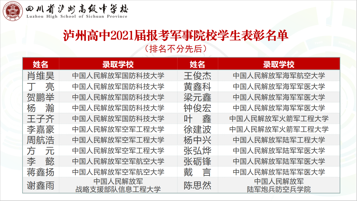 明安田宣讀了瀘州高中《關(guān)于表彰2021屆軍隊(duì)院校錄取學(xué)生的決定》,對(duì)肖維昊等22名被軍隊(duì)院校錄取的2021屆畢業(yè)生予以表彰。據(jù)悉,這是瀘州高中首次表彰被軍隊(duì)院校錄取的畢業(yè)生,被表彰的學(xué)生都是報(bào)考軍事院校的今年應(yīng)屆畢業(yè)生,他們繼承和發(fā)揚(yáng)瀘高人忠勇報(bào)國(guó)的優(yōu)良傳統(tǒng),堪為瀘高學(xué)子從軍報(bào)國(guó)的表率。